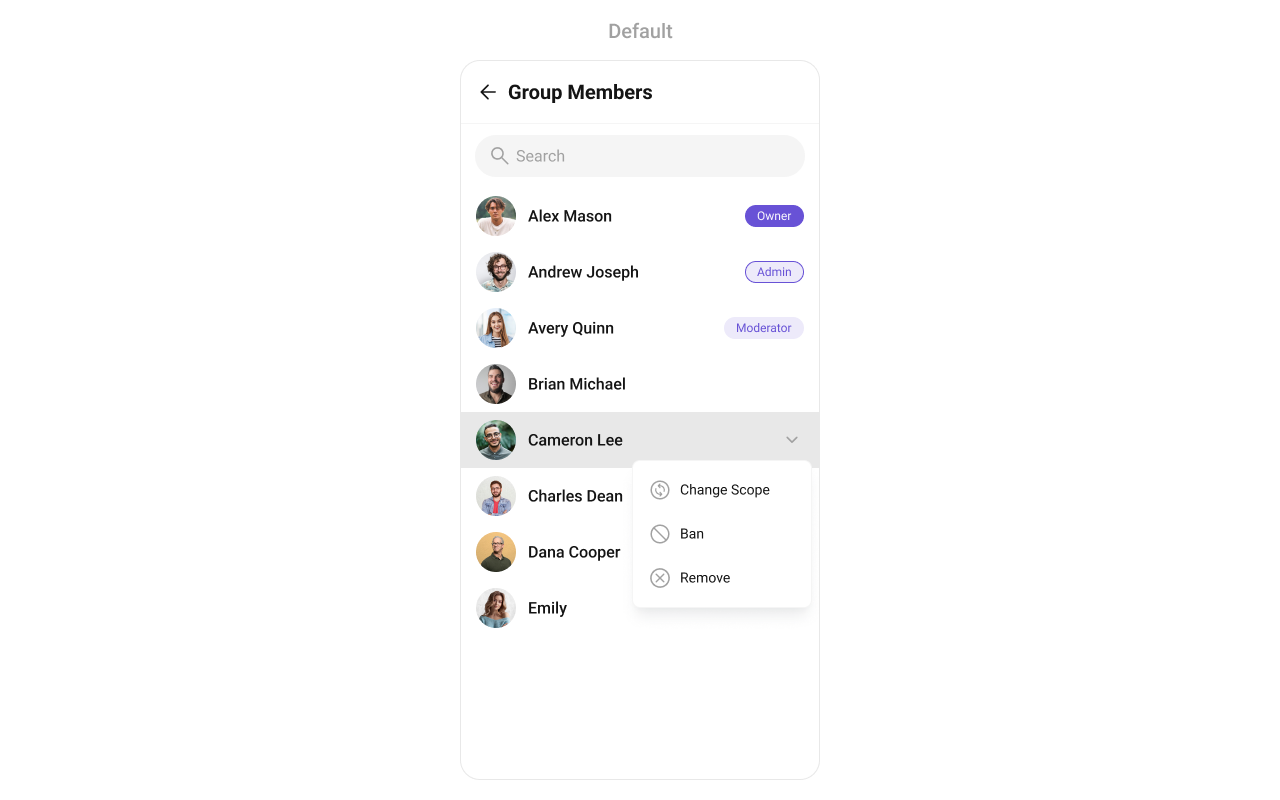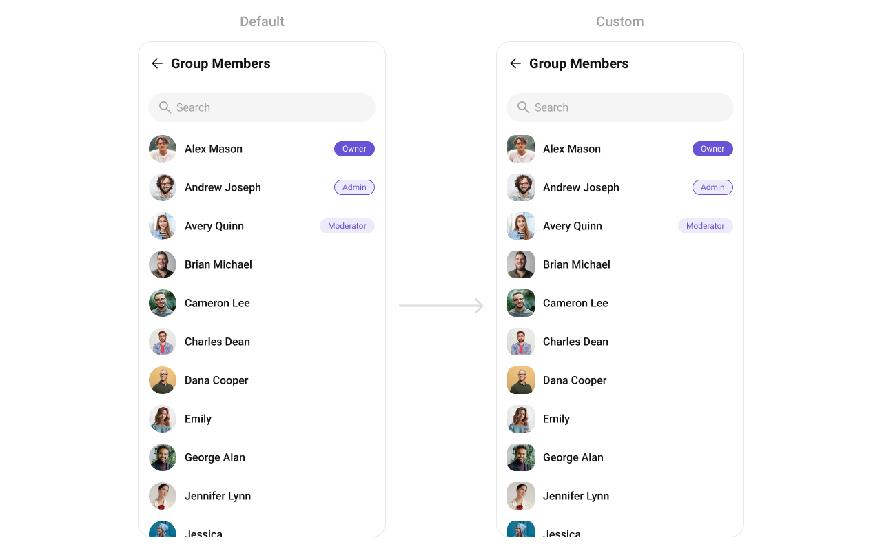 For advanced-level customization, you can set custom views to the component. This lets you tailor each aspect of the component to fit your exact needs and application aesthetics. You can create and define your own views, layouts, and UI elements and then incorporate those into the component. The Group Memebers component does not provide additional functionalities beyond this level of customization.