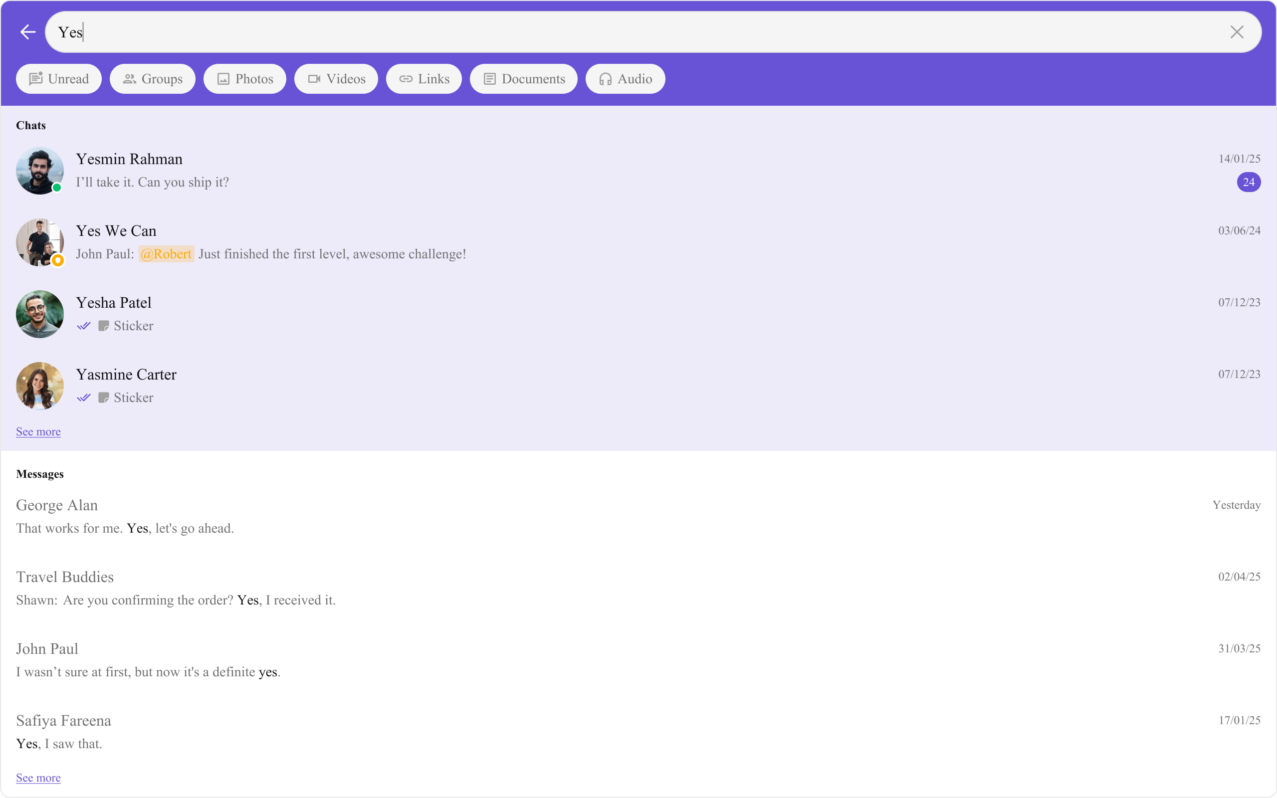 Search FiltersList of filters to be rendered in the Search component.searchFilters={[CometChatSearchFilter.Messages, CometChatSearchFilter.Photos, CometChatSearchFilter.Audio, CometChatSearchFilter.Documents]}